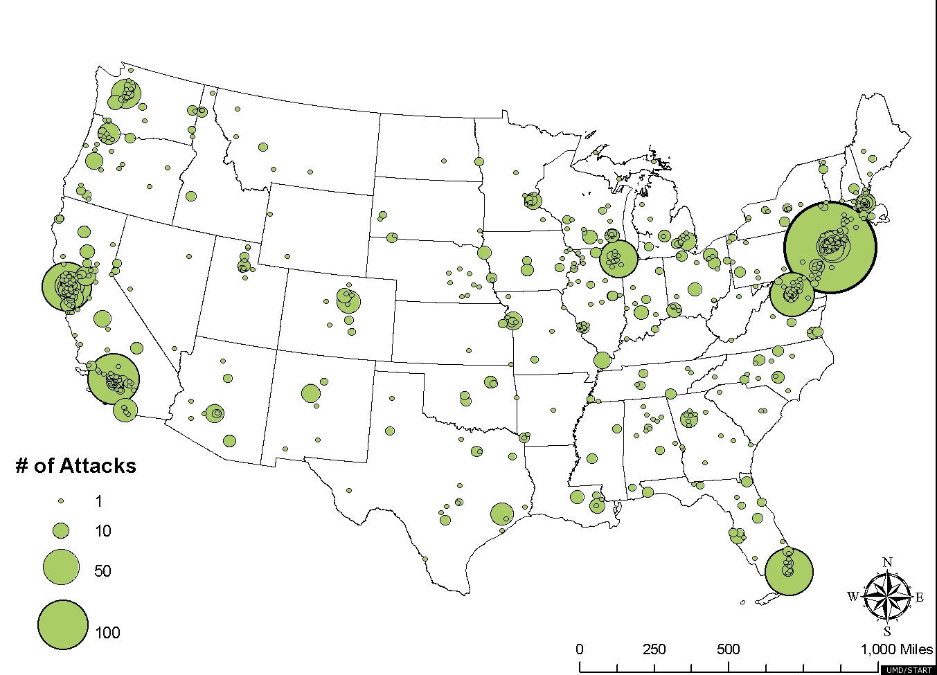 Doctor DeFree’s interest in the geographic concentration of terrorism was very evident in a study released in early 2012. Through careful analysis of data gathered from 1970 to 2008, START was able to compare each of the 3143 counties in the United States – identifying 65 of them as “hot spots” that have experienced a higher than average rate of terrorist attacks. Some of those counties, like Maricopa County, Arizona, have experienced increased levels of terrorism since the year 2000, whereas areas like King County, Washington have diminished in such respects over the years, although they were once considered a hot spot at one time. New York City and Los Angeles have endured steadily down through the years as areas in which terrorism is a high possibility. In the same way, the motivation and typical image of a terrorist has changed over the past 4 to 5 decades, since many attacks perpetrated in the 1970s were due to left-wing groups in Berkley, San Francisco and the surrounding areas of California – rather than Islamist groups that carry that reputation today. All research for this study was based on the basic definition of terrorism and terrorist attacks as “the threatened or actual use of illegal force and violence by a non-state actor to attain a political, economic, religious, or social goal through fear, coercion, or intimidation.” The report also categorized the “violent perpetrators” into ideological subgroups, such as left-wing, right-wing, religious, ethnonationalist, or single issue.