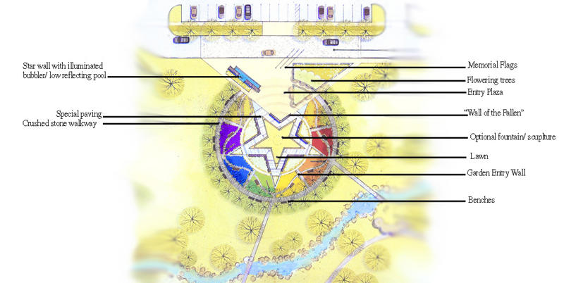 As a “living memorial” to those that have sacrificed their lives in the war against terrorism, the design of the garden brings these characteristics to life, around a central plaza that is in the shape of a star. A fountain, intended to symbolize never-ending hope and life, bubbles vibrantly in the midst of this plaza – while a black granite Wall of Honor, designed to resemble the Vietnam War Memorial, is inscribed with the names of those from Pennsylvania that have fallen in the war against terror. Another separate wall, located at the front of the garden, lists the names of those from York County, Pennsylvania that have fallen in battle since the inception of the Gold Star Mothers in 1928.